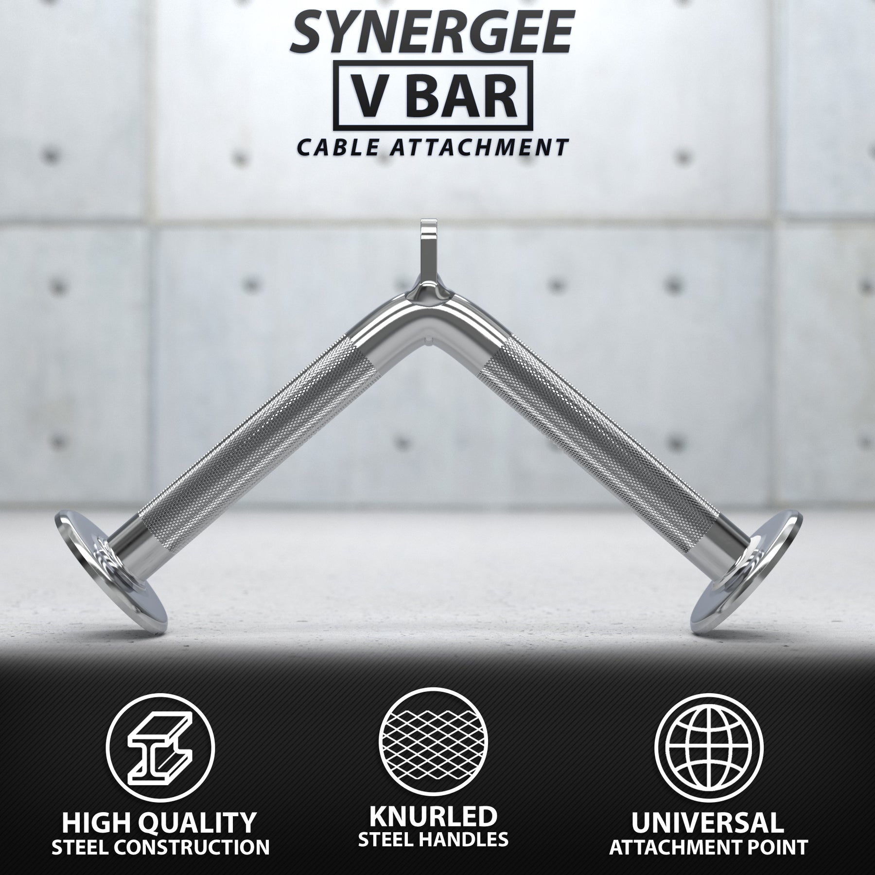 Our Synergee V-Shaped Bar includes a point for attaching onto any cable machine that has a standard carabiner. Simply clip the carabiner through the attachment hole and get to work! It’s as fast and as easy as that!