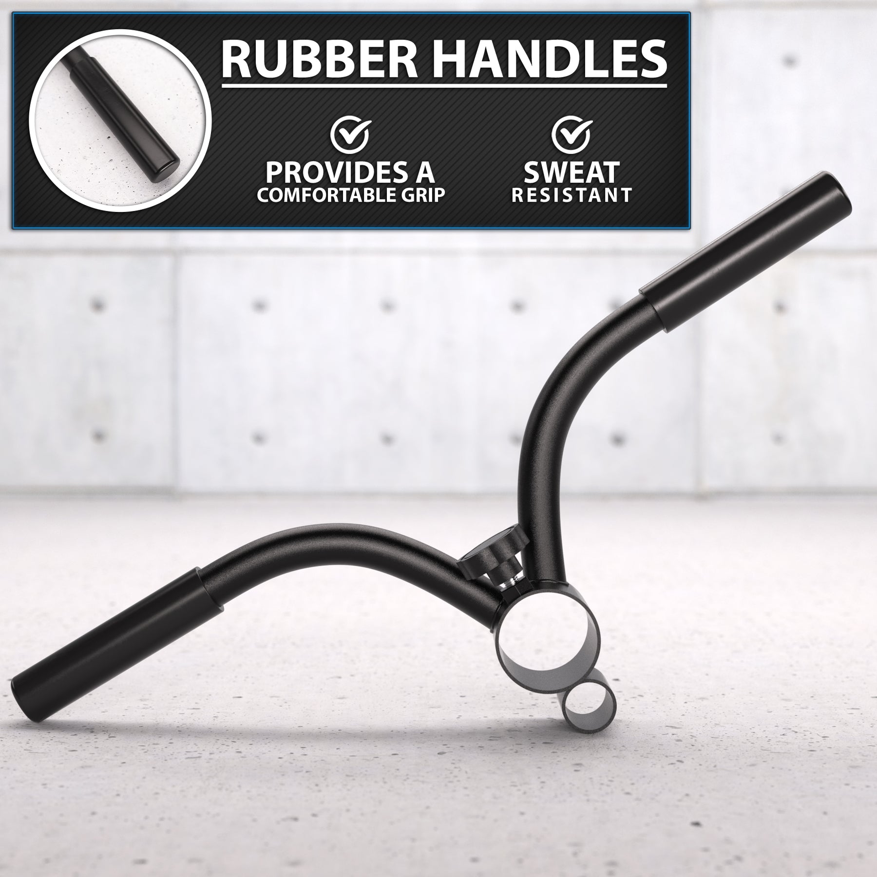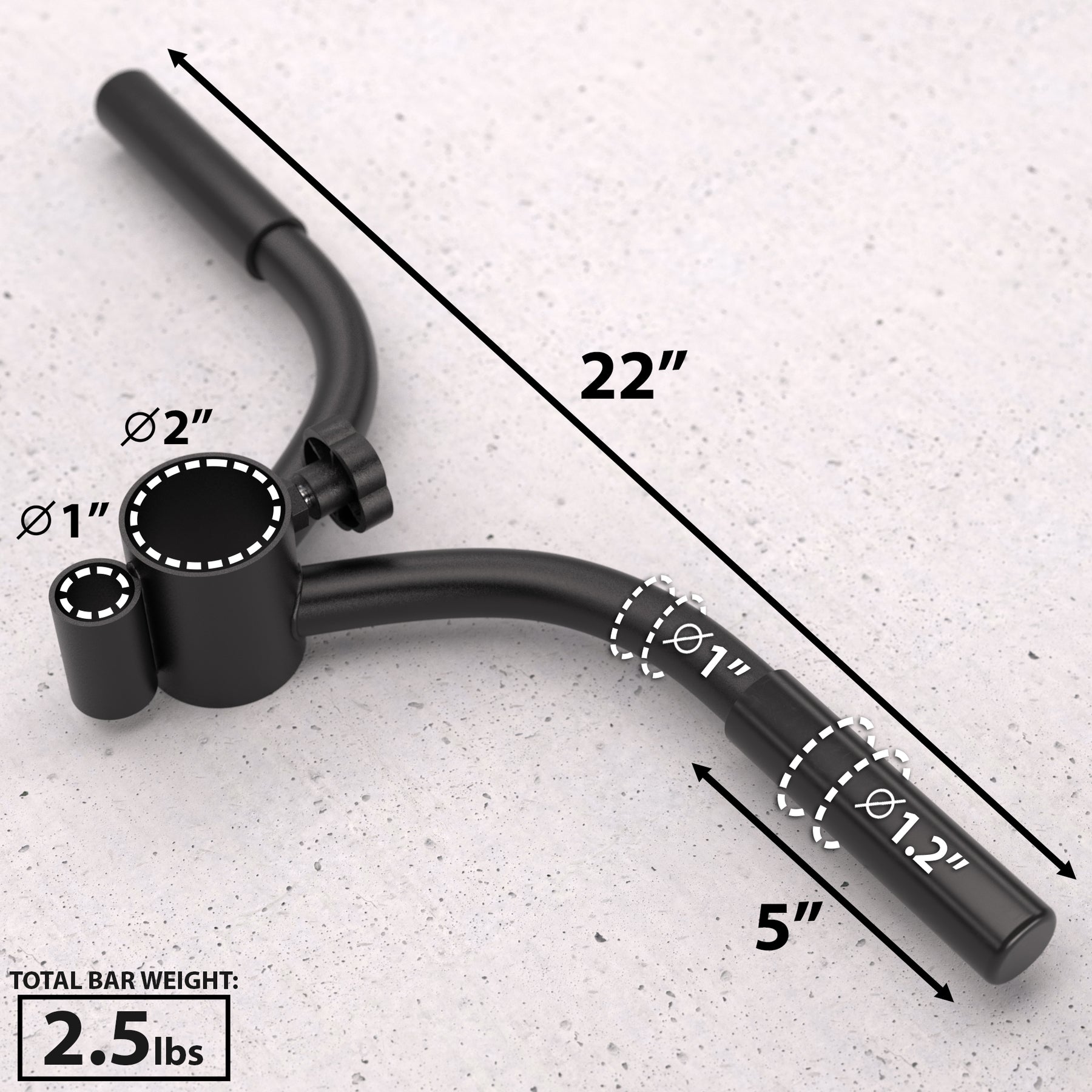 The Long Grip T Bar provides grips for wide, bilateral pulling exercises. Each style of handle has collars for 1” and 2” barbells, rubber handles for better grip; and this particular handle is 22” wide with 5”-long and 1.2”-diameter handles on each side.