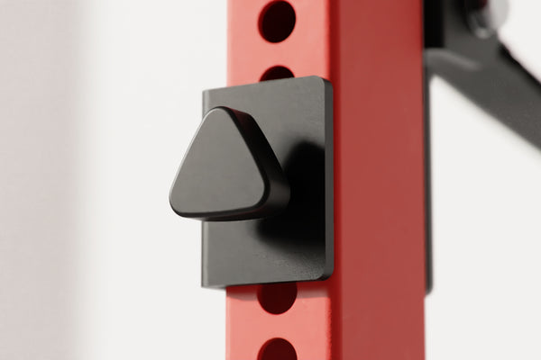 Rear-side tension knob locks the safety straps flush against the upright. Eliminates safety straps movement for a safer, more stable lifting environment.
