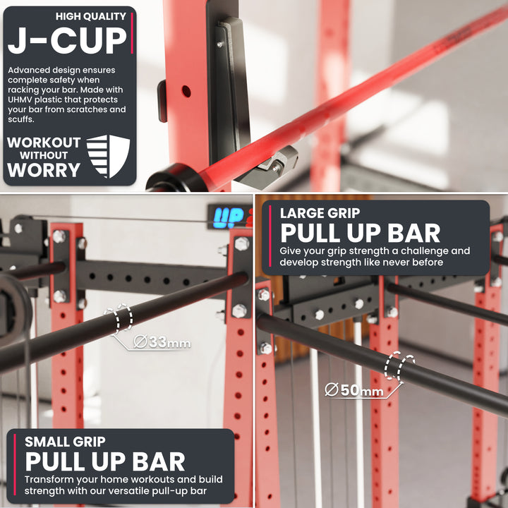 Our cage comes equipped with 2 styles of pull-up bars in 33mm and 50mm diameters, allowing for varied grip options to challenge your upper body and target different muscles. The sandwich-style J-cups, lined with UHMW, provide secure bar placement and protect your barbell from scratches and wear, ensuring each lift is smooth and safe.