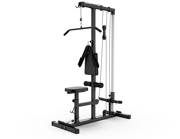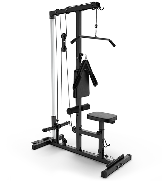 The Synergee Lat Pulldown Machine is a free-standing cable machine. It has 3 distinct zones for different workouts. The Top Exercise Zone provides a Lat Bar for pull-downs. Plus, a removable seat can be installed and quad rollers can be put to use if you want to perform them seated. The Mid Exercise Zone is the spot to perform weighted crunches, made extra comfortable by the padded harness with handles that’s included with the machine. The Lower Exercise Zone provides everything you need for standing rows, seated rows, curls and kick back. The handles provided with this machine are interchangeable, so you can set them at the height you need for your unique workout routines. Plus, the universal attachment points means any other cable workout handles can also be used on machine.